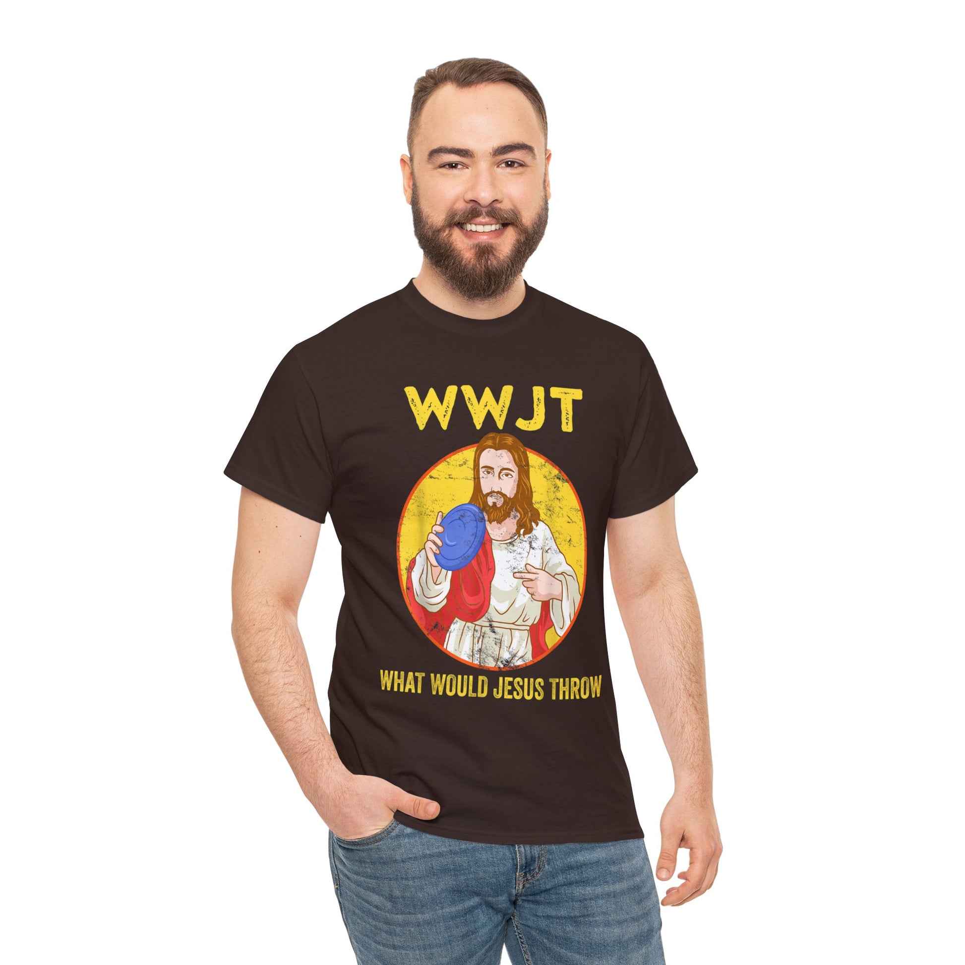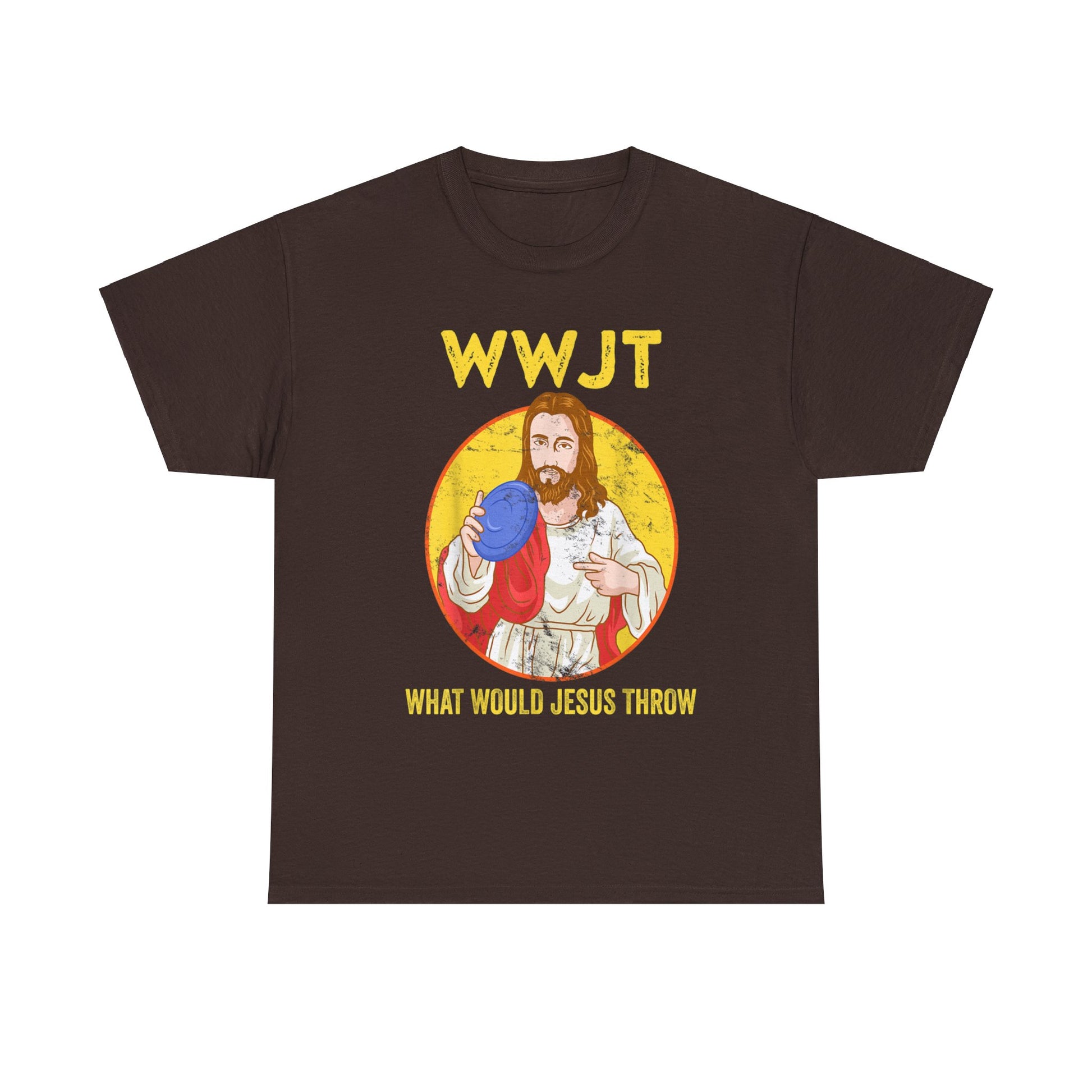 Introducing our "What Would Jesus Throw" disc golf shirt, now available in a short sleeve T-shirt style! This unisex heavy cotton tee is a versatile wardrobe staple that combines comfort, style, and sustainability.